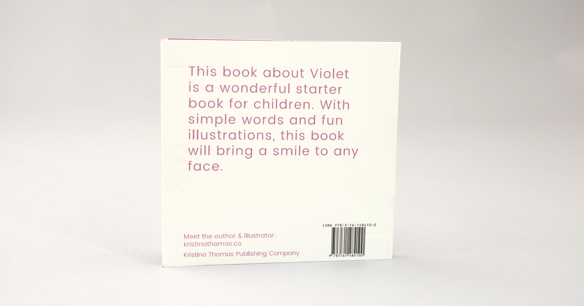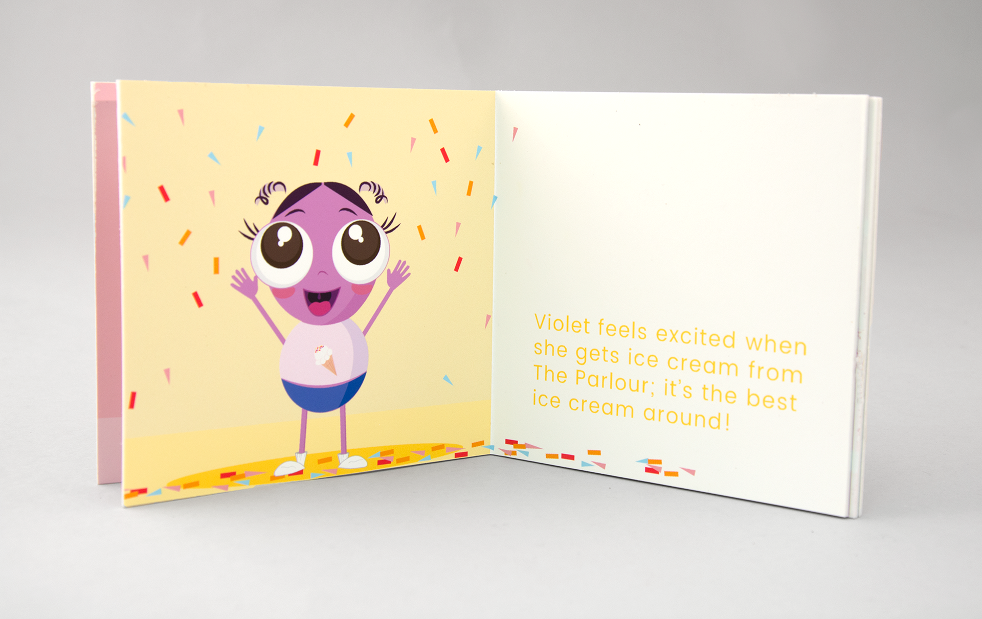 Violet Has Feelings is a children's book about expressing emotion. The character was self illustrated. The pages of the book feature the character using facial expressions, as well as the colored background to display an emotion. For instance, Violet is excited and smiling in the first spread. Yellow is used as the background color because yellow carries with it the feeling of joy.