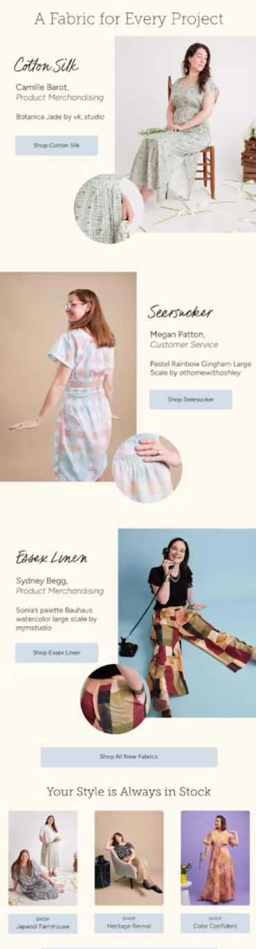 MY ROLE: The images shown below are part of Spoonflower's annual Me Made May campaign, which is when Spoonflower invites its employees to participate in creating garments and apparel using Spoonflower fabric. This years Me Made May featured 4 new apparel fabrics. In years past Spoonflower would shoot employees against a white background as the standard. This year I proposed doing a more stylized shoot with props to enhance the photos, and to highlight the apparel. I also hoped that in creating a more intentional set, the participants would be made to feel special, especially given the time and effort and creativity it takes to create apparel. My role was to style and prop each set, but one major hurdle was that we had a tight budget for this shoot, so we had to use items we had on hand, or items we could rent, which was an exciting constraint to find a solution for. I also stood alongside our photographer, giving feedback and direction. Lastly I created emails, and social media posts for the campaign. Overall, this was one of my favorite projects to work on despite there being an intense time constraint, and working with no budget.