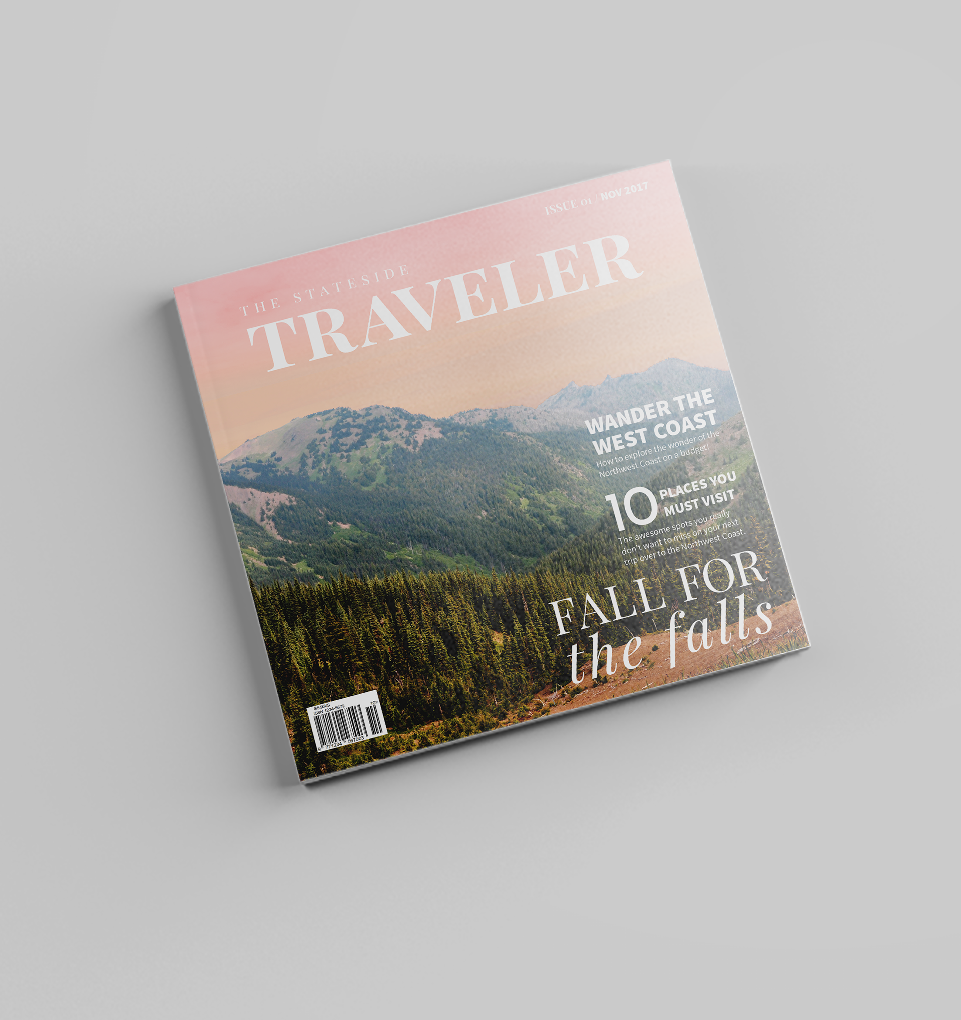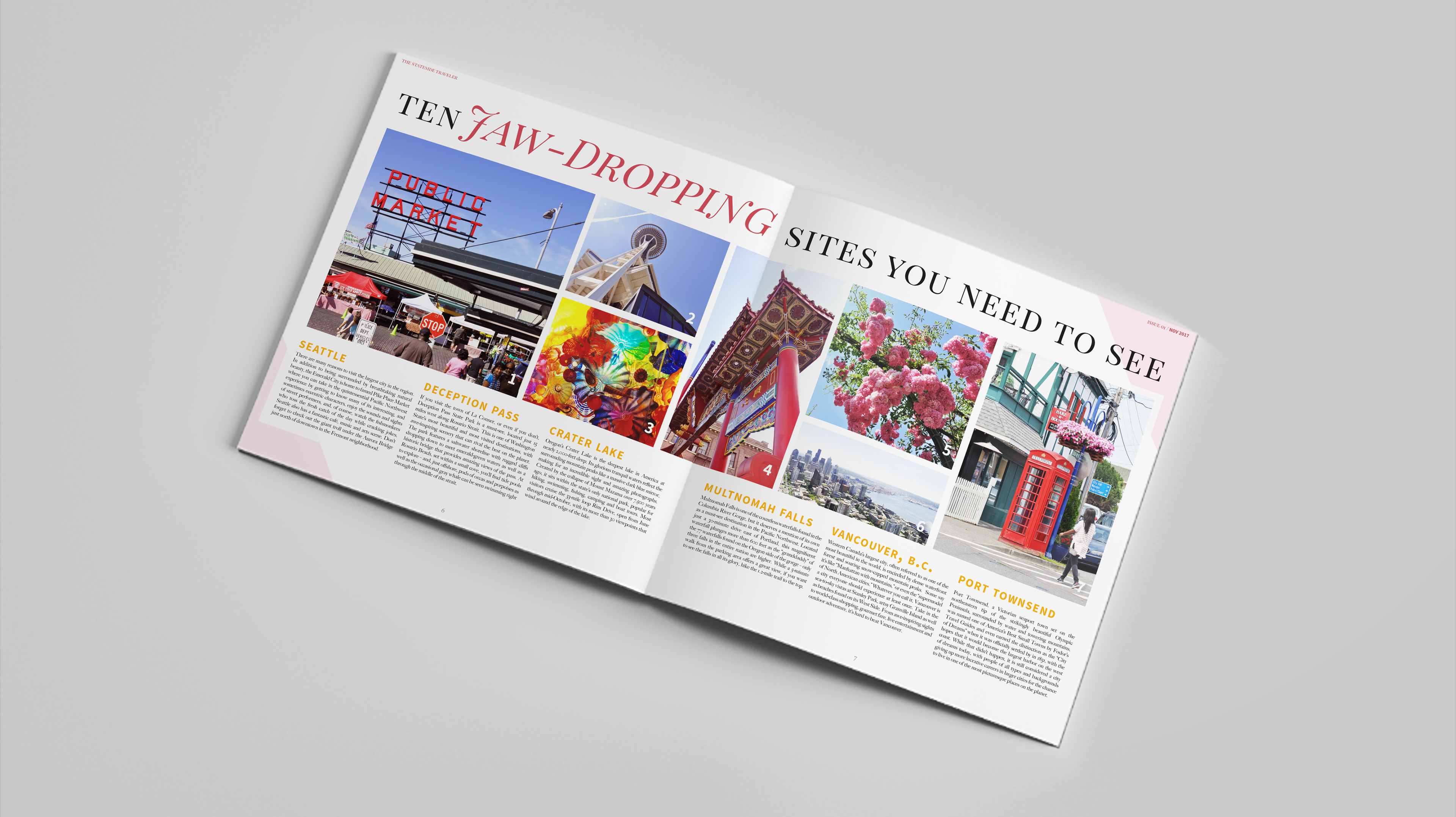 The masthead for the magazine uses a serif font with dramatic thick and thin strokes so that at first glance the magazine looks classic and even a bit upscale. Subheadings use a san serif typeface to make sure that in addition to being classic, it looks modern.Because it is a travel magazine, photography plays a large role. The colors within the photographs are used throughout the magazine in the headings and subheadings.